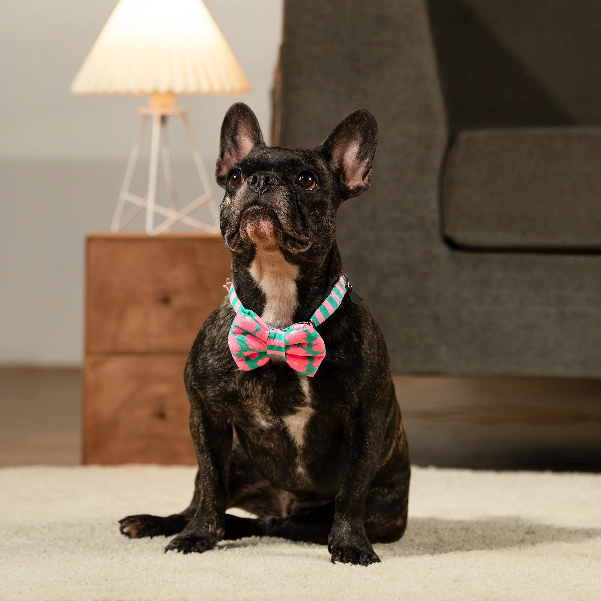 Let your dog's style shine with our Summer Bloom collar and bow tie set in bold blue! Crafted from soft, pet-safe fabric, this collar features a charming mix of floral and striped patterns that perfectly blend functionality with fashion. The detachable bow tie adds just the right touch of flair for every activity. Designed with an easy buckle closure and adjustable strap, it ensures a secure, comfortable fit your dog will love. The D-ring provides reliable leash attachment, while the delicate dangling logo charm adds that final polished detail.